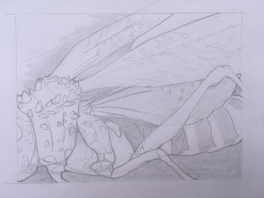 This is one of my favorite paintings because of its vibrancy, quick brushstrokes and brilliance. The textures and colors of the rainbow bush locust certainly appealed to me as an artist and while researching I found that locusts are social grasshoppers.